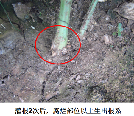 試驗(yàn)結(jié)果:根腐發(fā)病部位上方長出新根,植株恢復(fù)健康生長。
