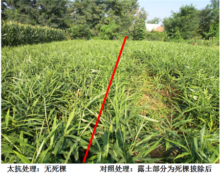 試驗(yàn)結(jié)果:整個生育期使用3遍“枯木逢春”組合之后,大姜的死棵得到很好的控制,防效達(dá)到90%以上;