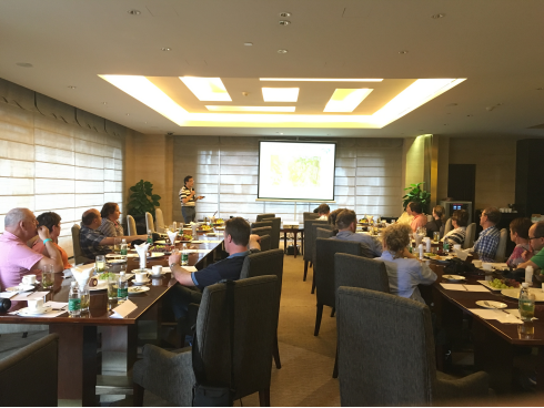 會(huì)上,董事長(zhǎng)黃永博士詳細(xì)講解了太抗系列產(chǎn)品的作用機(jī)理及各地應(yīng)用案列,得到了所有與會(huì)人員的高度關(guān)注。當(dāng)講到太抗產(chǎn)品的安全性時(shí),外賓們紛紛將在燒杯中的樣品看了又看,聞了又聞,可能實(shí)在覺得看似酸奶的生物農(nóng)藥著實(shí)稀奇。PPT放映結(jié)束后,外賓們接連提問(wèn),關(guān)于產(chǎn)品的保質(zhì)期、使用技術(shù)、投入產(chǎn)出比等等,董事長(zhǎng)一一解答,連喝水的空都沒(méi)有。其中,來(lái)自來(lái)自維多利亞州的Gary Jeans講到其種植有4000公頃有機(jī)李用于出口中國(guó),非常希望能用上太抗系列產(chǎn)品!此外,有外賓提出想帶些樣品回澳洲,也有外賓提出想和我公司澳洲研發(fā)人員深入交流,更有外賓要了黃董厚厚一疊名片說(shuō)是要去澳洲幫我們做宣傳!