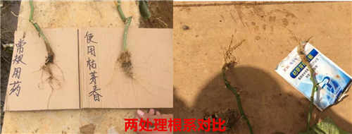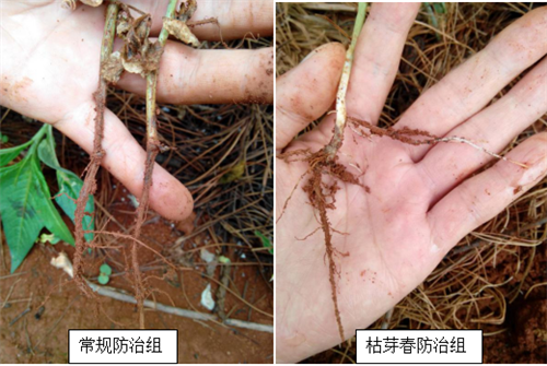 常規(guī)防治組死根更嚴重,植株開始枯萎;枯芽春組已經(jīng)開始長出新須根,植株健康