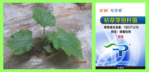黃瓜的根系分布較淺,吸收能力相對較差,而黃瓜對氮、磷、鉀等營養(yǎng)元素需求量大,吸收速率快,因此苗期養(yǎng)好植株根系是黃瓜高產(chǎn)栽培的基礎(chǔ),苗期用枯芽春TM對植株進行灌根,在根系周圍形成枯草芽孢桿菌保護層,不僅能促進根系生長,亦能防治黃瓜后期枯萎病的發(fā)生。